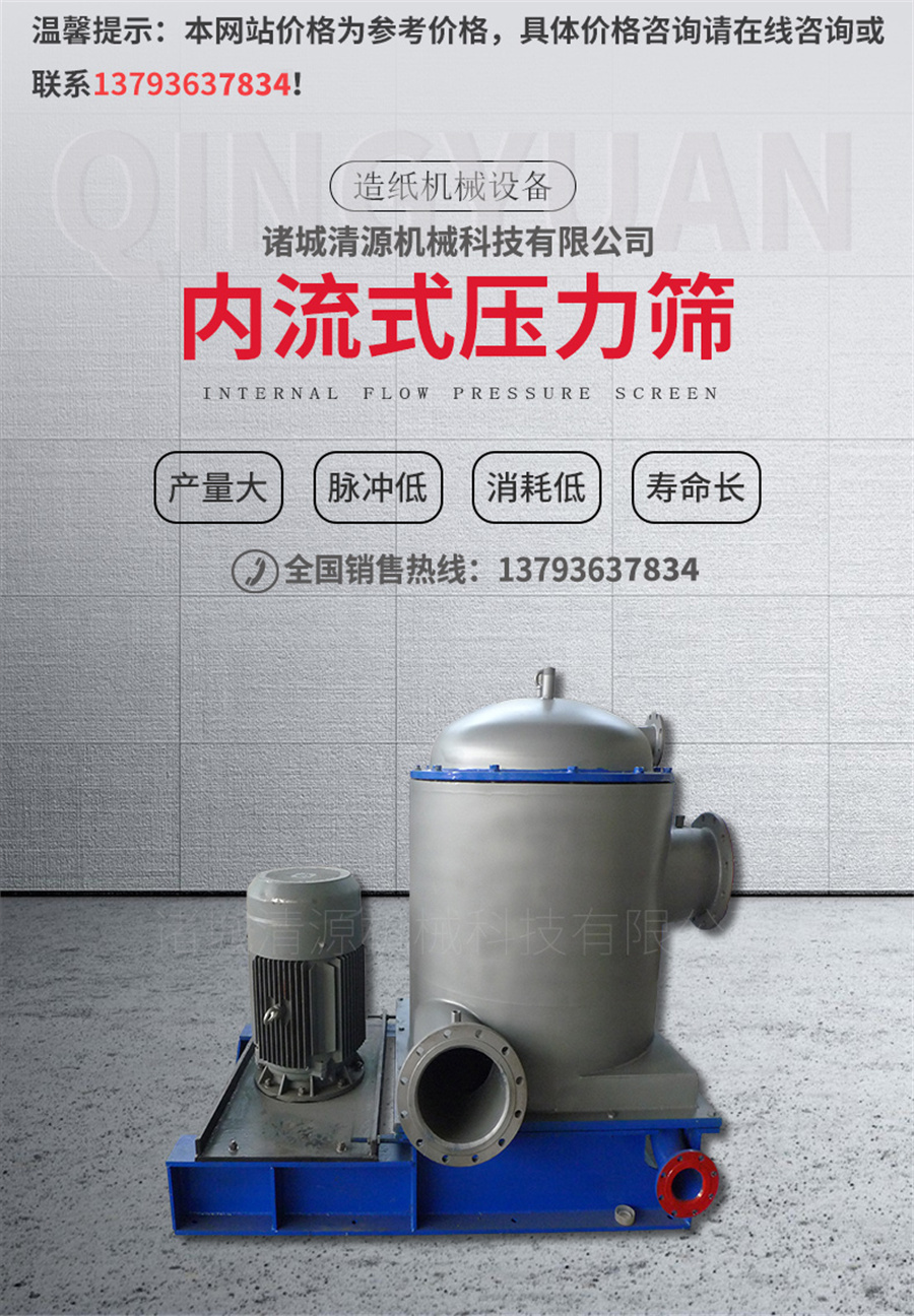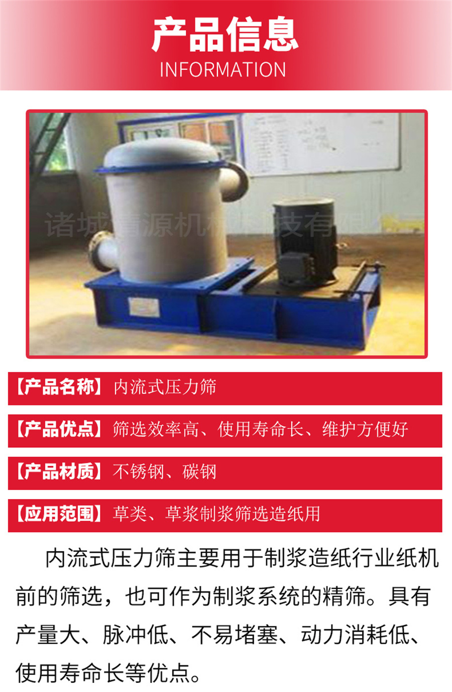內(nèi)流式壓力篩是當代造紙行業(yè)較好的篩選設備。內(nèi)流式壓力篩適用于化學漿、磨木漿及廢紙漿的篩選。目前多用于造紙機前的漿料精選,對于提高成品紙的檔次,降低能源消耗起著重要的作用。