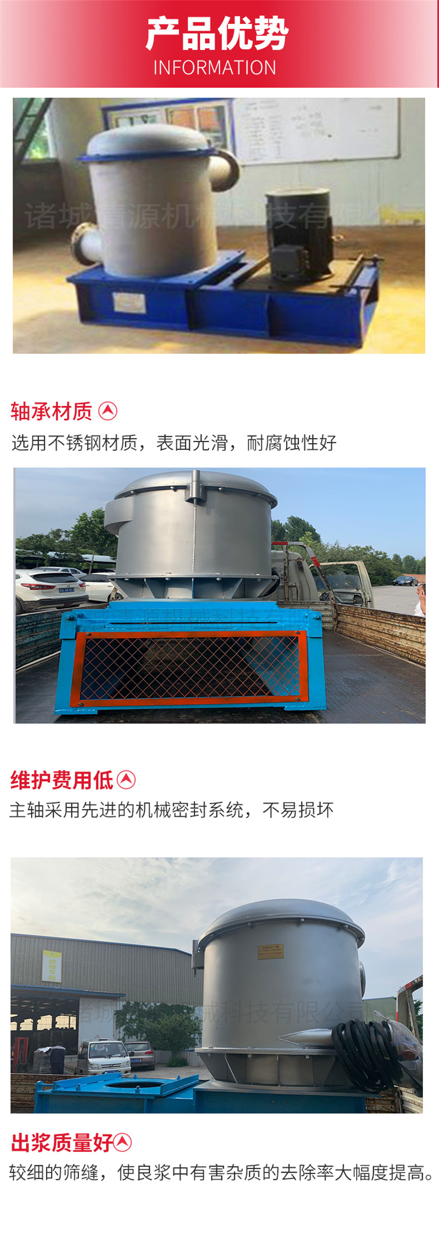 5、良漿質(zhì)量好:本機篩鼓選用厚不銹鋼板精工制造,可選用較細的篩縫,使良漿中的有害雜質(zhì)(如各種膠念物、云母、臘點、塑料膜等)的去除率大幅度提高。由于采用了較好的波紋形狀,雖然縫隙小,但產(chǎn)量不會受太大影響。